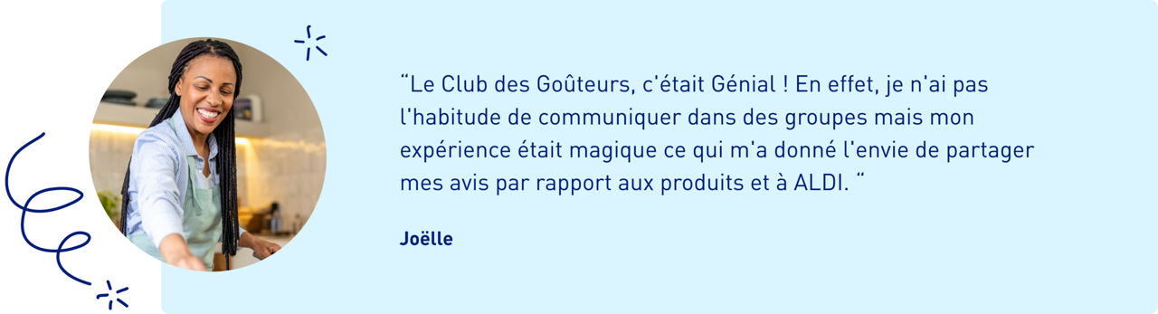 Le Club des Goûteurs ALDI est un club privé de consommateurs sélectionnés pour tester et évaluer les produits des marques ALDI. À chaque saison, nos Goûteurs ALDI reçoivent une box à domicile contenant des produits, différents à chaque fois, soigneusement choisis pour eux.